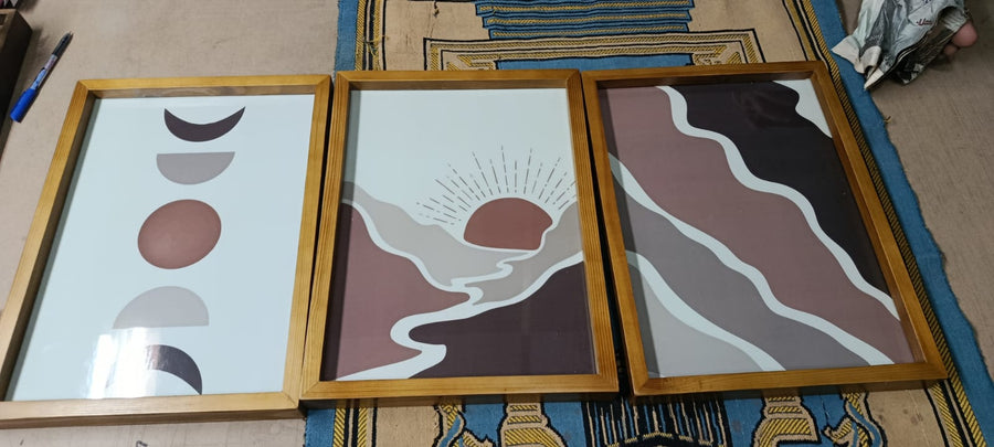 The paintings are much more beautiful than the pictures, honestly. The materials are very high quality, and the finishing is neat and clearly shows that the work was done with care. The colors are calm, very chic, and perfectly match the space. They also arrived intact, and the packaging was excellent. Thank you so much; this will not be our last interaction, God willing ❤️